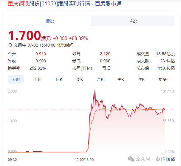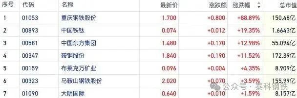 截至发稿,重庆钢铁股份(01053.HK)涨近90%,盘中最高一度飙涨超130%;鞍钢股份(00347.HK)、中国东方集团(00581.HK)均涨逾10%。马鞍山钢铁股份(00323.HK)、大明国际(01090.HK)等公司也均有跟涨。