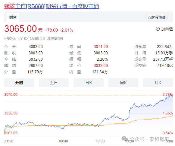 螺纹钢主力合约日内涨2.61%,现报3065.00元/吨。