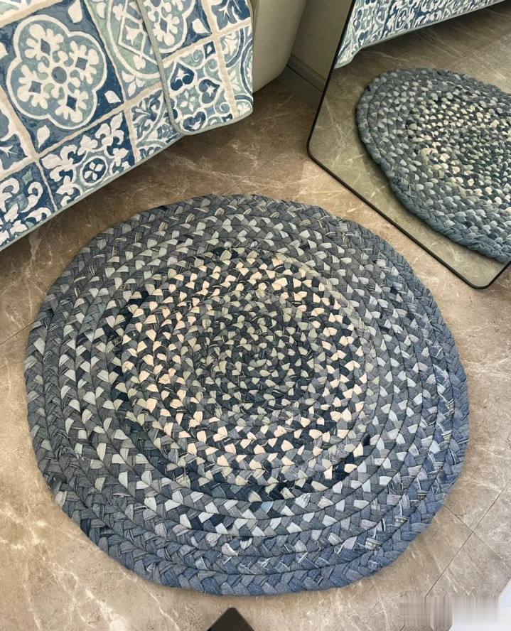 比如不穿的牛仔裤,你可以将这些牛仔裤裁剪成细条,然后编织起来做一个牛仔地垫,纯手工制作的,又好看又实用。