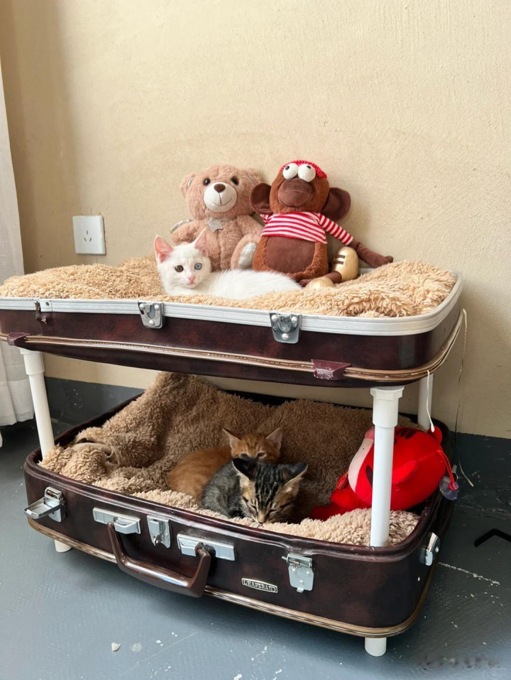 如果行李箱的样子已经不喜欢了,却又不舍得扔,放在家里用不上,也可以改造成一个双层猫窝,给家里的猫咪安排上一个大房子,把行李箱拆卸下来,上下两层用pvc管衔接就可以了。