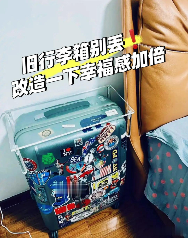 行李箱只有在出差旅游的时候会偶尔用得上,大部分时候都是闲着在家里的,放在柜子上面有影响美观又占地方,其实闲置的行李箱也可以换一个思路使用,比如把它当做床头柜。