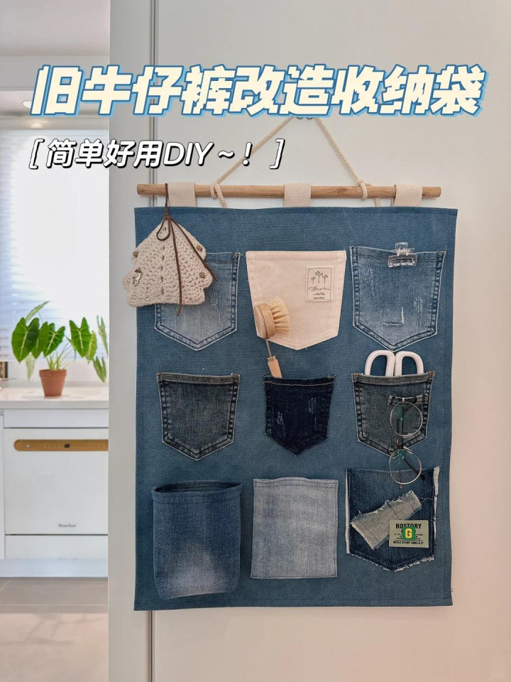 不穿的牛仔裤可以将裤腿拆下来,当做底部,然后将牛仔裤上面的裤兜缝在底部上面,就可以当做一个可以悬挂的墙上收纳袋。