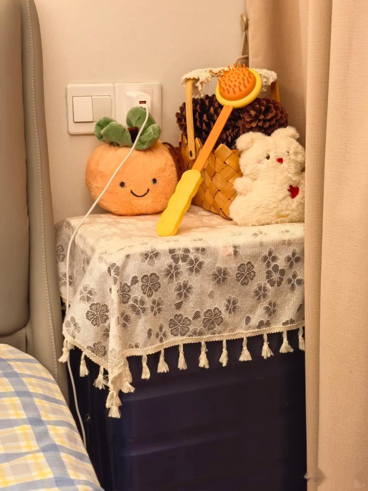 想怎样放就怎样放,简单装饰一下,毫无违和感,既解决了行李箱收纳问题,又搞定了床头柜的问题,租房党,暂时住的比较适用。