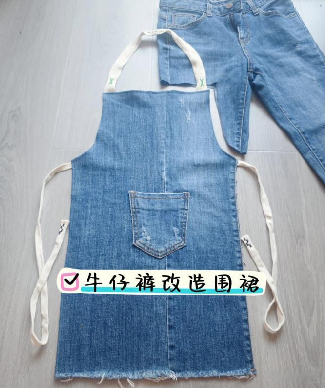 不穿的牛仔裤还可以裁剪下来一条裤腿,制作成一个牛仔围裙,然后把牛仔裤上面的裤兜拆卸下来缝在围裙中间,再做好绑带就可以了。